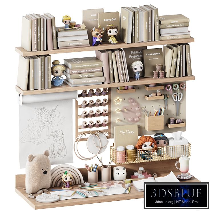 Toys, wall decor and desks in the nursery for fans of Disney cartoons Toys, wall and desk decor in a children room for Disney cartoon lovers This decorative 3D set will take you into the world of childhood and your favorite cartoons! The set is complemented by objects: *Favorite cartoon characters of the princess: "Aladdin" Jasmine, "Cold Heart" Elsa, Cinderella, Rapunzel, "Brave Heart" Merida, "Beauty and the Beast" Belle and the Beast *Books with an easily adjustable color palette. *Creative clutter: Rolled paper, a full set of children's tools, a pegboard decorated with pencils, scissors, paints, brushes, palette, napkins and colorful tape will create an atmosphere of the creative process, and Lego details will diversify the table's contents, and a set for needlework and embroidery with colorful threads, embroidery frames hoop) will create a creative atmosphere, as well as lego elements, a magic wand, a milkshake, soft toys in the form of a bear and a cat. *Children's masterpieces: Colorful children's drawings on the tabletop and an open book add warmth and comfort to the scene Version of Corona 11 Materials CoronaLegacyMtl (CoronaMtl) + Vray In versions of CoronaRender 6 and below, CoronaLegacyMtl=CoronaMtl Vray version 5 The Vray materials were obtained using the Vray converter 3dsmax version – 2020 Number of polygons without smoothing: 565049 Number of polygons with smoothing 1 iteration: 655315