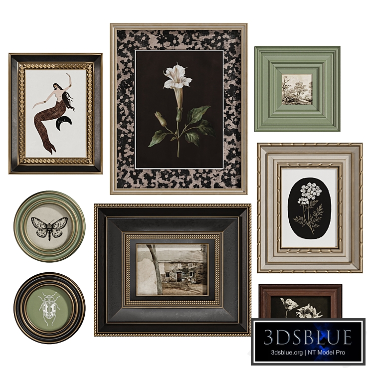 Name: Vintage Curiosity Wall Set 002 Description: A charming 3D wall art set designed for interior spaces, bringing a touch of vintage nostalgia and classic elegance to any room. This collection features nine beautifully framed illustrations - including timeless landscapes, antique motifs, whimsical flora, and subtle vintage textures. Rendered in soft, neutral tones with natural wood frames, it adds warmth and character to living rooms, bedrooms, hallways, or study areas, creating a cozy, storybook-like atmosphere with a refined, classic look. Key Features: • 8 framed wall art pieces with classic vintage and timeless themes • Ideal for living rooms, bedrooms, hallways, or study areas • Soft, neutral color palette with natural wood frames for a warm, elegant feel • Render Engines: Optimized for Corona 9 and V-Ray 6 Compatibility Notes: • For V-Ray versions below 3.1, BRDF in materials uses Microfacet GTR (GGX). Adjust manually if needed. • For Corona Renderer, use version 1.5 or higher for best results.