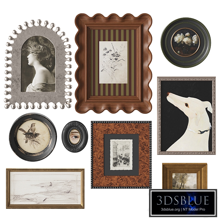 Vintage collection of paintings ZS01. The set includes: - photo/picture frame by Jan Barboglio Designs - photo/picture frame made of wood with waves https://www.etsy.com/no-en/listing/4312584725/mucha-vida-graffiti-polaroid-art-print - photo/picture frame is round with worn paint - round photo/picture frame with flowers - oval wooden photo/picture frame - metal photo/picture frame - horizontal metal photo/picture frame - metal horizontal small photo/picture frame Other collections of paintings: https://3dsky.org/collection/shared/5447438 The model is made in Corona10, all materials in Corona LegacyMtl In versions of CoronaRender 6 and below, CoronaLegacyMtl=CoronaMt When using OBJ, please apply MeshSmooth/TurboSmooth with 1-2 iterations.