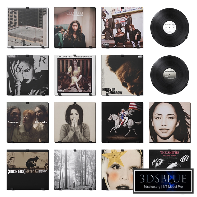 A set of popular vinyl records in beige-white and red-black tones, designed to decorate shelves, cabinets, etc. For better demonstration, the objects are presented separately on wall mounts. Dimensions of records: 32x31 cm, disc diameter: 30 cm. The set includes: 1. ARCTIC MONKEYS - The Car 2. Labrinth Euphoria Season 2 3. THE NEIGHBOURHOOD - Hard To Imagine The Neighborhood Ever Changing 4. RIHANNA - Rated R 5. LANA DEL REY - Blue Banisters + vinyl disc 6. THE WEEKND - Hurry Up Tomorrow + vinyl disc 7. PARAMORE - This Is Why 8. BJORK - Debut 9. BEYONCE - Cowboy Carter 10. SADE - The Best Of Sade 11. LINKIN PARK - Meteora 12. TAYLOR SWIFT - Folklore 13. HALSEY - The Great Impersonator 14. The Smiths - The Queen Is Dead 15. LADY GAGA - Mayhem 16. ABBA - Gold 17. TAYLOR SWIFT - Fearless 18. ARCTIC MONKEYS - Am 19. TAME IMPALA - The Slow Rush 20. TWENTY ONE PILOTS - Blurryface 21. BILLIE EILISH - Happier than ever + vinyl disc 22. WHITNEY HOUSTON - I Will Always Love You 23. ABBA - The Visitors 24. ADELE - 25 25. COLDPLAY - Parachutes 26. ARIANA GRANDE - Eternal Sunshine + vinyl disc 27. LANA DEL REY - Ultraviolence 28. THE WEEKND - The Highlights Materials - CoronaPhysicalMtl. Material maps with resolution - 2K (2048x2048). Textures and materials have logical names. Texturing – RizonUV. The Turbosmooth modifier is applied to the objects during rendering (geometry for anti-aliasing). Adjust the degree of anti-aliasing as you need via Main -> Iterations. The Isoline Display checkbox isolates the geometry during anti-aliasing. If materials are stretched on the seams of the material scans (there are pull-ups), instead of Turbosmooth, you need to apply the OpenSubdiv modifier (in the OpenSubdiv Controls -> UV Boundary -> Smoth (Edge only) submenu, iterations are adjusted through General Controls -> Iterations, Isoline Display - isolates geometry during smoothing). Archive: max2021 Corona obj (Corona) Material library .mat Textures in the map 2K folder units of measurement: mm polys: 402,912 / verts: 403,160 (at 0 iterations on all objects in the scene) Renders for the preview were made in Corona Render 12. Corona Render version 1.5 or higher is required.