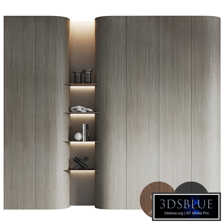 Cabinet Monolithic: - cabinet in three veneer finishes with sections of 500 mm - wall panel in plaster material -shelves made of metal with lighting in the profile (CoronaLightMtl/VrayLightMtl) - decor Bombey https://cornerdesign.ru/shop/bombey - Numa vases https://cornerdesign.ru/shop/numa - Azur chain https://cornerdesign.ru/shop/azur-chain Objects are partially attached, textures and materials have logical names TurboSmooth open For Corona render, it is recommended to install a version of at least 1.5, since the glossiness of materials is configured taking into account PBR Those who work in V-Ray versions lower than 3.1, be careful, in the materials in the BRDF section there is Microfaset GTR ( GGX ), if your version is older than 3.1, then the BRDF field will be empty. Choose Blinn, Phong or Ward - whichever suits you best