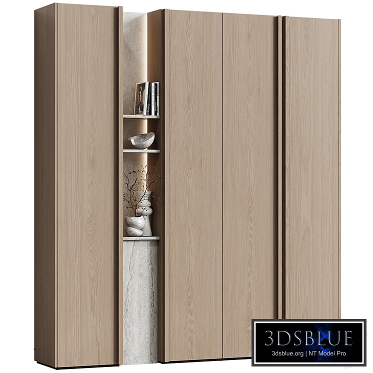 Wardrobe in a modern minimalist style 132 with stone shelves and a pedestal. Description: CORONA Legacy Materials! 3ds MAX 2016 Facades with an overlay wooden handle. Finishing: tinted oak veneer, travertine, marble. Suitable for interiors: Scandinavian, minimalist, Japandi, wabi-sabi, modern. Suitable for interiors: living room, hallway, bedroom, study. Modular cabinets with open shelving and decor. The model can be easily edited if necessary. Custom-made cabinets. The scene has three color options. (The wood tinting was done using the standard color correction map built into 3ds Max.) The scene includes all the decor that is in the preview: - vases; - books; - branches.