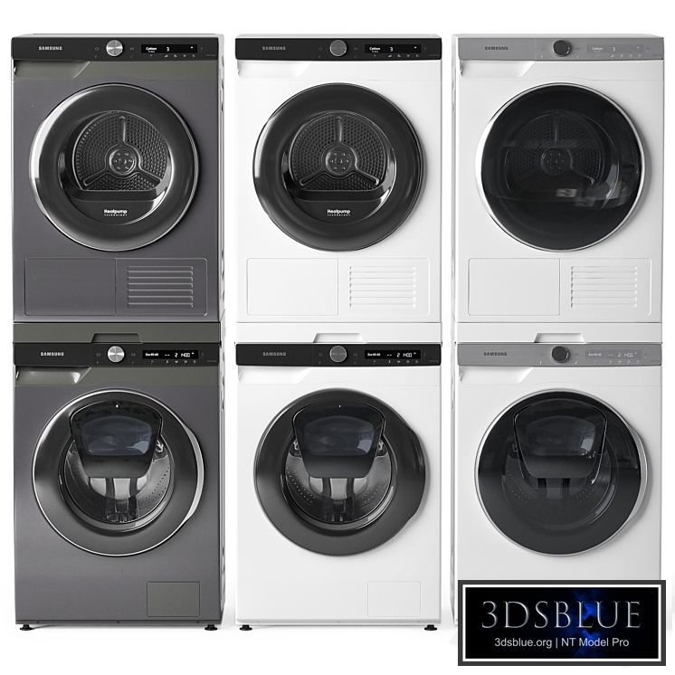 Samsung washer and dryer in three colors. In the scene there are six models of cars with connecting strips as in the preview. - Washing machine Samsung WW90T554CAT1 (Samsung WW10T654CLX) Dimensions (WxHxD) 60x85x63.5 cm - Dryer Samsung DV90T5240AT (Samsung DV90T8240SH) Dimensions (WxHxD) 60x85x66 cm - Connecting bar Samsung SKK-UDX Dimensions (WxHxD) 60.5x7.5x56.5 cm Smoothing models. When rendering, the Turbosmooth modifier with a value of 1 was applied to the model. High quality 3d model. The archive contains: - max2016 (VRay 3.60.03) - max2016 (Corona 4) - OBJ - FBX - jpg (textures) Units: mm Polys: 829765 Verts: 801158 The model is fully textured with all materials applied. All textures and materials are included and displayed in every format. Objects and materials are logically named for ease of scene management. Pre-rendering with Corona. Stage lighting is not included in the model. The model does not include the backgrounds or scenes used in the previews. Those who work in V-Ray versions lower than 3.1, be careful, in the materials in the BRDF section there is Microfaset GTR ( GGX ), if your version is older than 3.1, then the BRDF field will be empty. Choose Blinn, Phong or Ward - whatever suits you best.