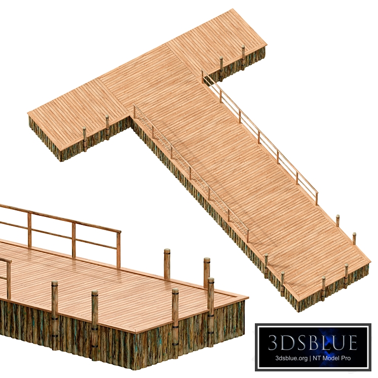 3d model of a wooden river pier, berth. Boardwalk made of light wood, wooden railings, poles for tethering boats with metal rings. Along the perimeter, the pier is supported by logs. The texture of the logs is aged, simulates the effects of time and water. If desired, the design and dimensions of the berth can be easily changed by copying or removing model elements. Overall dimensions: 1600cm x 1200cm x 200cm The archive contains: all texture files with materials for Vray, Corona and Fstorm. additional formats FBX, OBJ Number of polygons: 49996 Number of vertices: 55186
