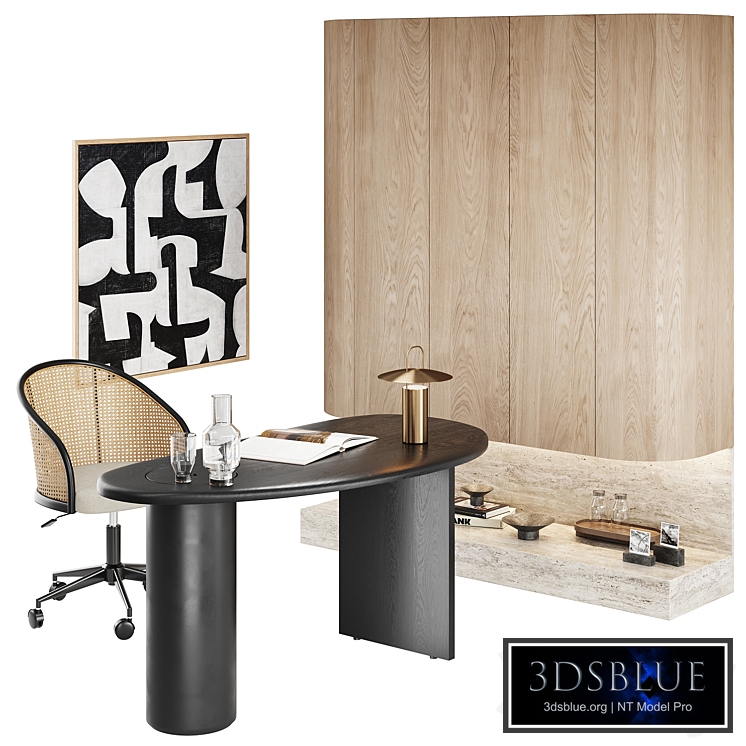 Workplace | Work area Inside the set: Audo (MENU) Eclipse office desk, Dagmar office chair, Ray MENU table lamp, Cecil Touchon abstract painting, books, decanter, glasses, glasses, open book, Polaroid photo, tray, travertine wall panel, table top, rattan, decor. Modern Soft Minimalism | Japandi | Wabi sabi | Scandinavian https://smalltablelamp.ru/store/tproduct/369246554-750221469921-rabochii-stol https://www.burkedecor.com/products/dagmar-office-chair-by-euro-style-39178-bg?c=office-chairs https://smalltablelamp.ru/store/tproduct/223836065-916874511531-nastolnii-svetilnik