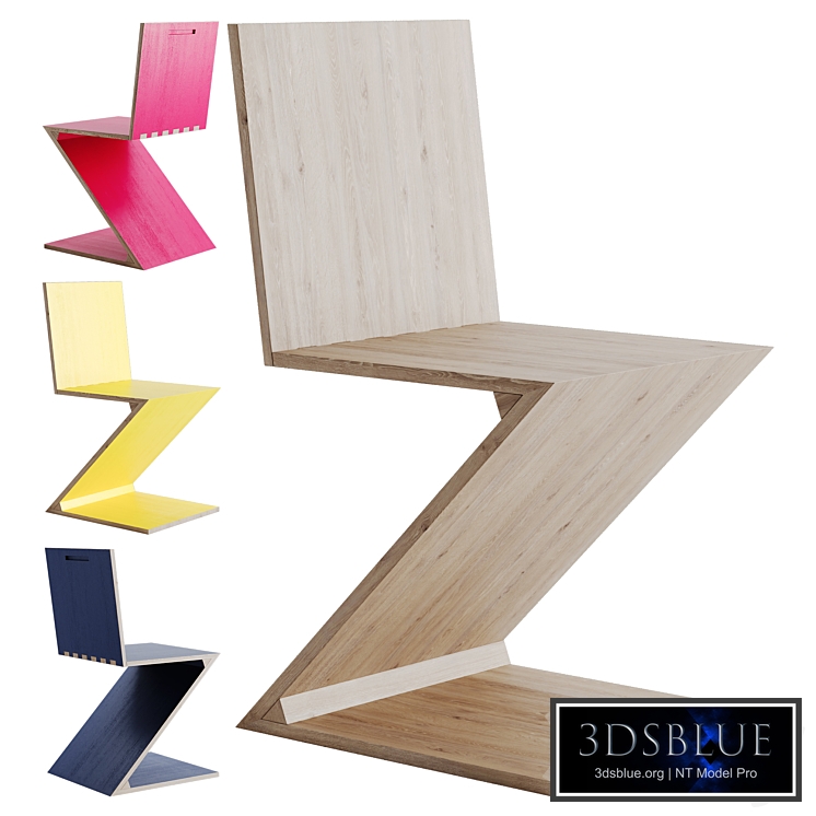 Name: Zig Zag Chair Type: model Format: 3Ds Max 2015 Export: OBJ, MAT Render: Corona (12) Vray (5) Polys: 52696 Verts: 52720 Units: Centimeters Dimensions: 37.0 x 43.0 x 74.0 https://www.1stdibs.com/furniture/seating/chairs/set-of-two-zig-zag-chair-gerrit-thomas-rietveld-cassina/id-f_39290902/