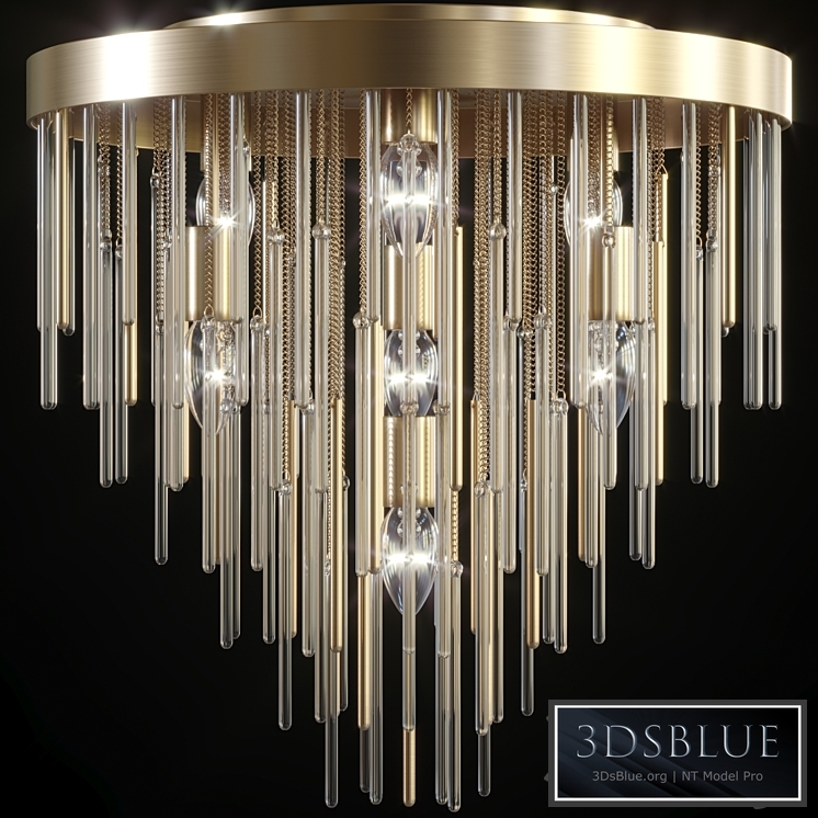 Art Nouveau chandelier on a string suspension with a brass-colored ring frame and a lampshade made of a combination of glass and metal rods (some of the rods are suspended from metal chains).