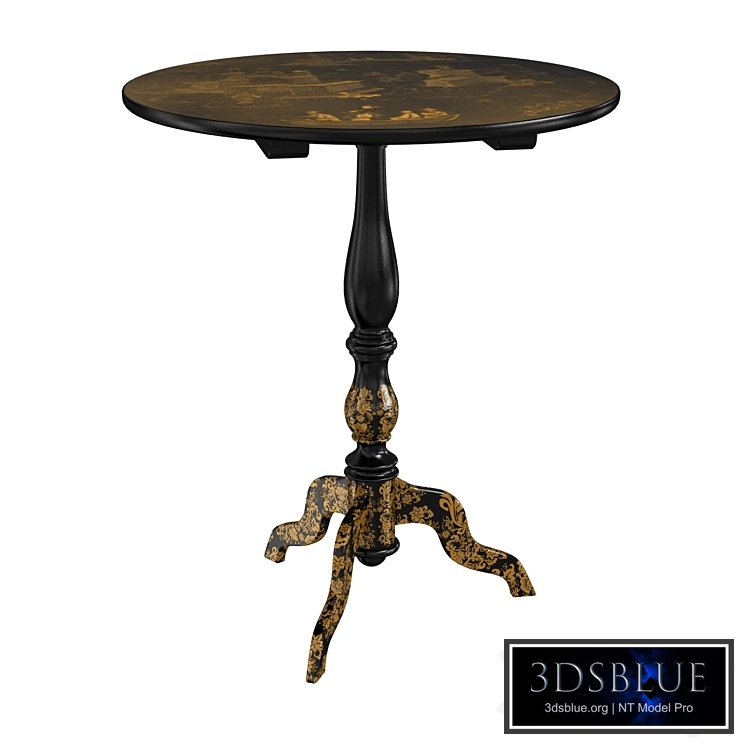 A Victorian inlaid lacquer tea table in the manner of Chippendale style, Circa19th century. Features a circular top with bird and flower inlay, raised on a tripod base with gilt accents and ball and claw feet.