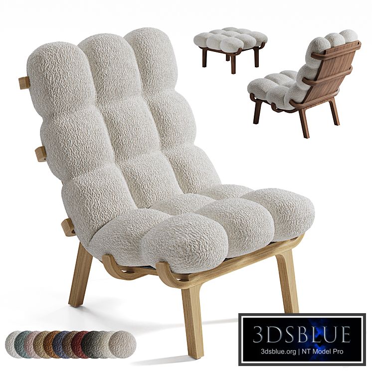 Armchair and pouf NUAGE by SOLLEN in 2 colors of wood and 12 colors of boucle.