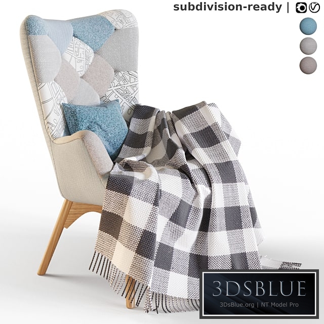 This chair model is called Julia Grup KNUT patchwork, La Forma KNUT blue or Poltrona Kody blu. There are 5 chair options in the archive - a patchwork, patchwork with a decorative pillow and a fringed blanket, a completely blue chair, a gray chair and a brown chair. Chair and pillow models can be used with the TurboSmooth modifier if the chair is close to the camera. Or you can turn off the subdivision modifier to reduce the number of polygons and speed up rendering.