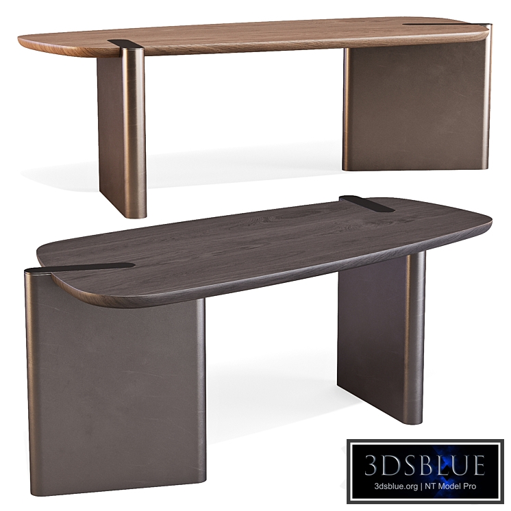 - Flatiron fully satisfies a multiplicity of roles. A presentational desk, writing desk, table: in every guise it comes across as a significant element thanks to the powerful sculptural expression of the harmonious, rigorous and elementary shapes and volumes. The shape of the body is a reference to the famous Flatiron Building skyscraper in New York: with a new formal line of semi-abstract inspiration, the softness of the surfaces and the shape of the rounded parallelepiped legs fit into the formal continuum of the wooden top with its organic lines. Flatiron's aesthetic lexicon gives it a leading role not just in the panorama of professional executive furniture, but also in prestigious representative dining and living environments. A characteristic feature of the Flatiron top is the metal insert, an extension of the leg which, in addition to its aesthetic function, can also perform a practical one: the insert has a cable slot that allows the desk top to be kept tidy.