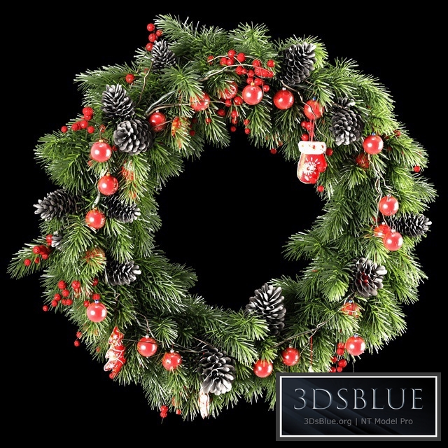 Christmas thick wreath of coniferous branches, rowan, cones, toys