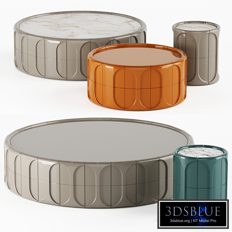 Concave coffee table enriches the living area with a sculptural touch and is characterized by a round shape embellished on the surface by many three-dimensional facets. It is available in various colors with a glossy or matt finish.