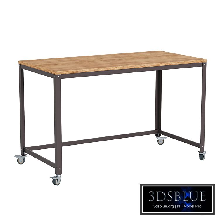 Industrial style computer desk with lockable wheels and lightly textured wood top.