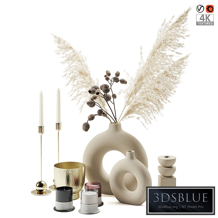 A set of dried plants (pampas grass and bellgum) and decorative elements from H&M Home: two minimal round ceramic vases, three candles, an golden pot and two candleholders - metal and ceramic.