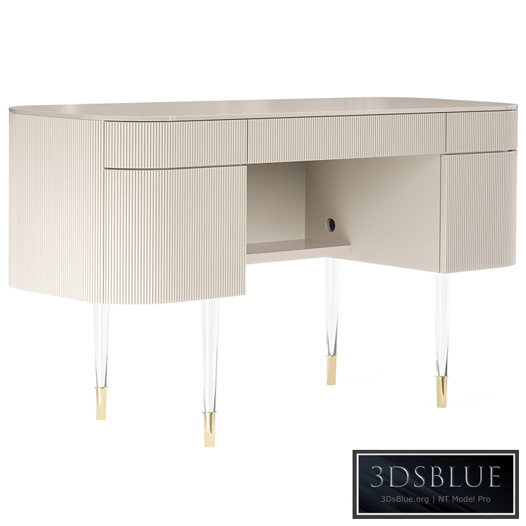 Glamorous storage comes to life in this elegant creation. With a touch of femininity, its graceful design creates a place for everything and somewhere to keep everything in its place. Use it as a desk or dressing table — or both! Its rounded silhouette features fluted detailing highlighted in a lustrous palette of Matte Pearl and touches of Whisper of Gold. This piece is stylish and versatile workstation, with the center drawer offering a drop-down for a keyboard and cord access while the left drawer provides a removable jewelry tray. Look behind each of its two doors and you'll find generous interior storage, cord access and a center shelf. Lovely acrylic legs capped with Whisper of Gold ferrules complete its fashionable appeal and make it an asset to any well-designed space.