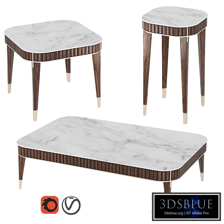 Tables with planks perimeter of cherry wood veneer with marble countertops. Brushed brass applications and legs.