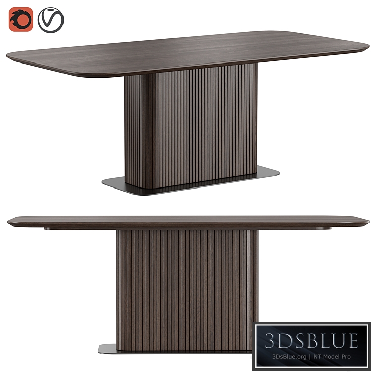Glide dining table from Dantone Home in a modern style. The table top and leg are made of MDF and oak veneer, the base is powder-coated metal. The leg is made in the form of a set of vertical slats.