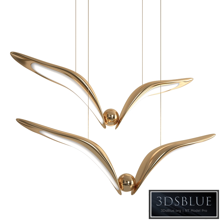 Suspended LED lamp with two curved shades, stylized as wings of a bird
