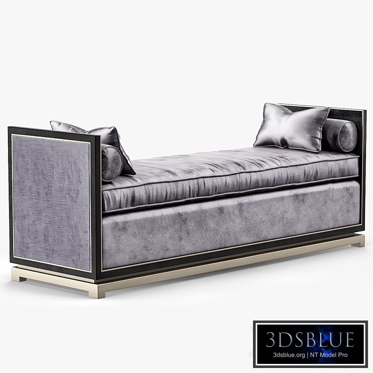 A cocktail of stunning materials, this chaise’s high gloss sycamore frame – stained in a classic dark grey – is accented with bronze trimming and upholstered in a lustrous purple cotton-silk fabric by Dedar. Contrasting pale grey piping and bronze-trimmed upholstered side panels add a refined finish.