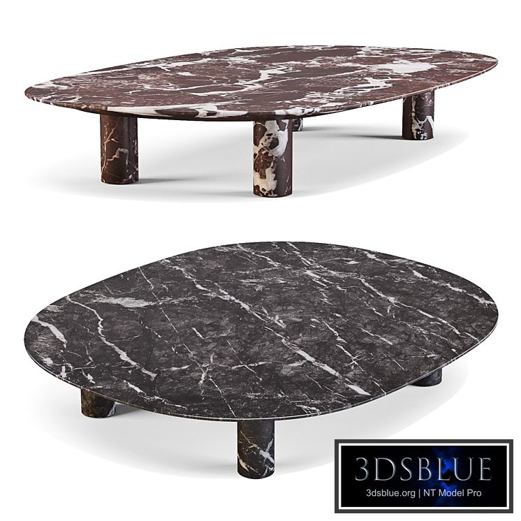 design with clear inspiration from the 1970s: four solid cylindrical legs support an oval top which, thanks to its flared detail, appears thin and light, creating a pleasant contrast between the consistency of the marble material and the visual lightness of the coffee table.