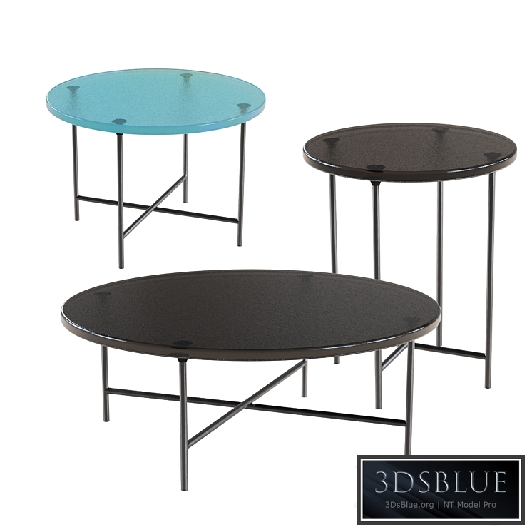 The coffee table on thin metal legs is made in a minimalist style. The round glass top is presented in a relief image giving it volume. The leg supports are interconnected by rungs that can serve as leg rests. Parameters 1∅450 h500, 2∅600 h400, 3∅800 h300, Polys-13 314