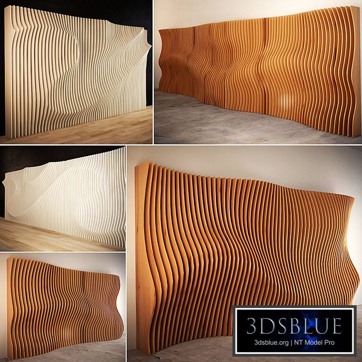 Parametric wall (parametric wall) 4 partitions: First the tiles on all sides of the second tile horizontally third tile horizontally when mirroring curvature (distortion depth) can be changed by scaling the horizontal axis. The total number of polygons: 34,730 In the archive: Max, FBX, mat, texture Scale: mm names in the Latin script, without blanks Tags: plywood, plastic, carving, lathe, CNC cutting, 3d wall panel, screen, wave, pattern