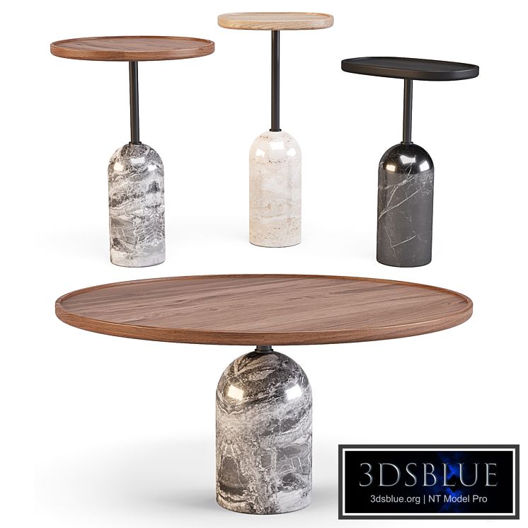 - Coffee table with cylindrical in white Carrara or Carnic grey marble, central pole in black matt metal and top in solid canaletta walnut with embossed edge. Side table with cylindrical marble base available in white Carrara or Carnic grey, central pole in black matt metal and top in solid canaletta walnut with lowered surface work.