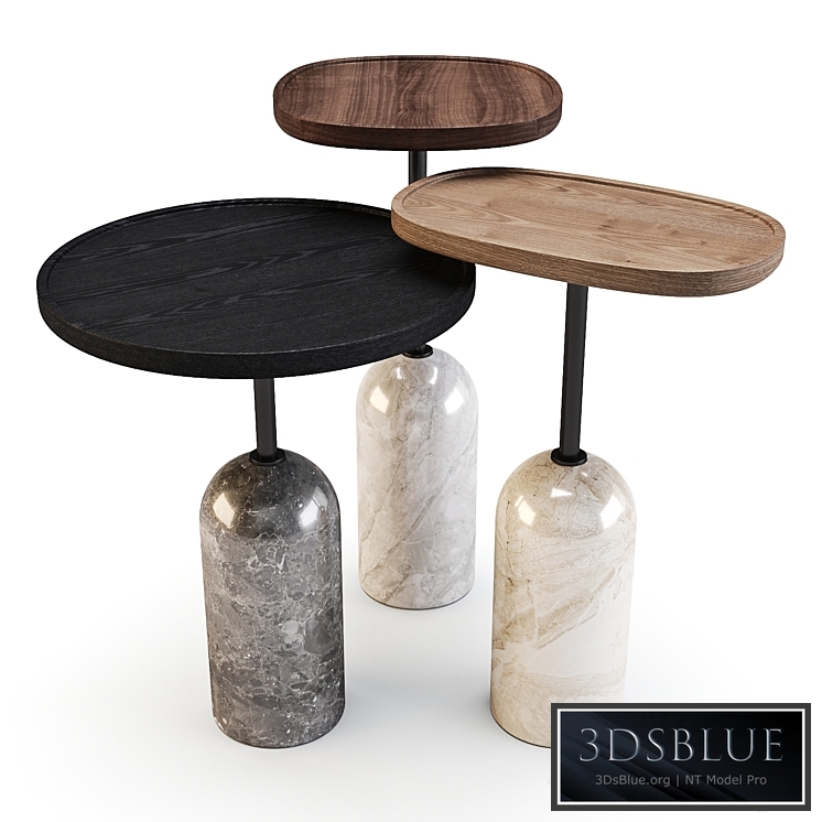 - Side table with cylindrical marble base available in white Carrara or Carnic grey, central pole in black matt metal and top in solid Canaletta walnut with lowered surface work.