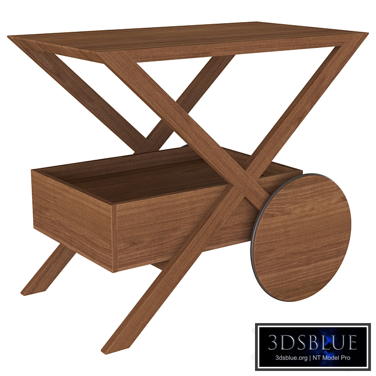 Service side table in canaletta walnut. Equipped with a drawer covered inside by cuoietto leather and wooden wheels.