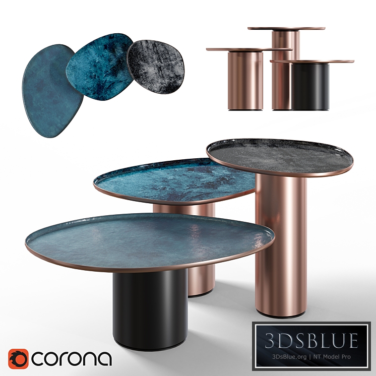 Drops is a family of coffee tables in three different sizes, inspired by the unexpected, irregular shapes of water droplets on the surface. Their soft, familiar lines embody the craftsmanship and know-how of De Castelli, reviving the traditional Technician by hand forging and shaping copper. the tables are thus a tribute to a tradition that, given a modern interpretation, is manifested in products that harmoniously integrate with everyday settings.