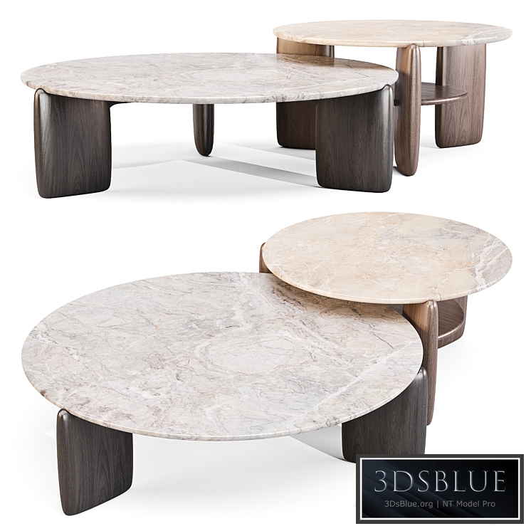 Kanji is a round ash and Fior di Pesco Carnico marble coffee table. Heavy elements are linked to lighter ones,
