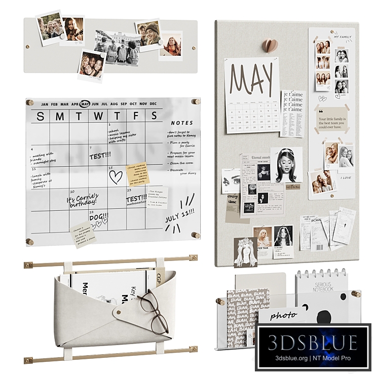 A note board in a teenager's room The TurboSmooth modifier is not minimized on some objects. You can adjust the degree of smoothing if necessary.(in viewport - 0 iterations, in render - 1 iteration) Wall decor for a teenager's room / transparent calendar with notes / photos / magnetic, cloth and marker boards / leather organizer pocket on the wall for notebooks and textbooks / transparent shelf with notebooks / glasses / stickers / collages _________________ The preview renders are made in Corona 9. CoronaLegacyMtl materials. For Corona render, it is recommended to install a version not lower than 1.5, since the glossiness of the materials is configured with PBR in mind. The Vray materials were obtained using the Vray converter. Those who work in V-Ray versions lower than 3.1 be careful, the materials in the BRDF section contain Microfaset GTR ( GGX), if your version is older than 3.1, then the BRDF field will be empty. Choose Blinn, Phong or Ward – which is preferable for you Archive: max2016 Corona max2016 V-Ray fbx (Corona,V-Ray) units: mm polys: 56 310 / verts: 37 402 Textures and materials have logical names. Texturing UnwrapUVW