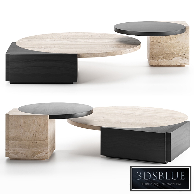 The Tribeca Tables are a series of sculptural side and coffee tables. Crafted in black silk marble and travertine with a stepped detail that reflects the soaring local architecture, the smooth round table top cantilevers over a monolithic square base, balancing perfectly.
