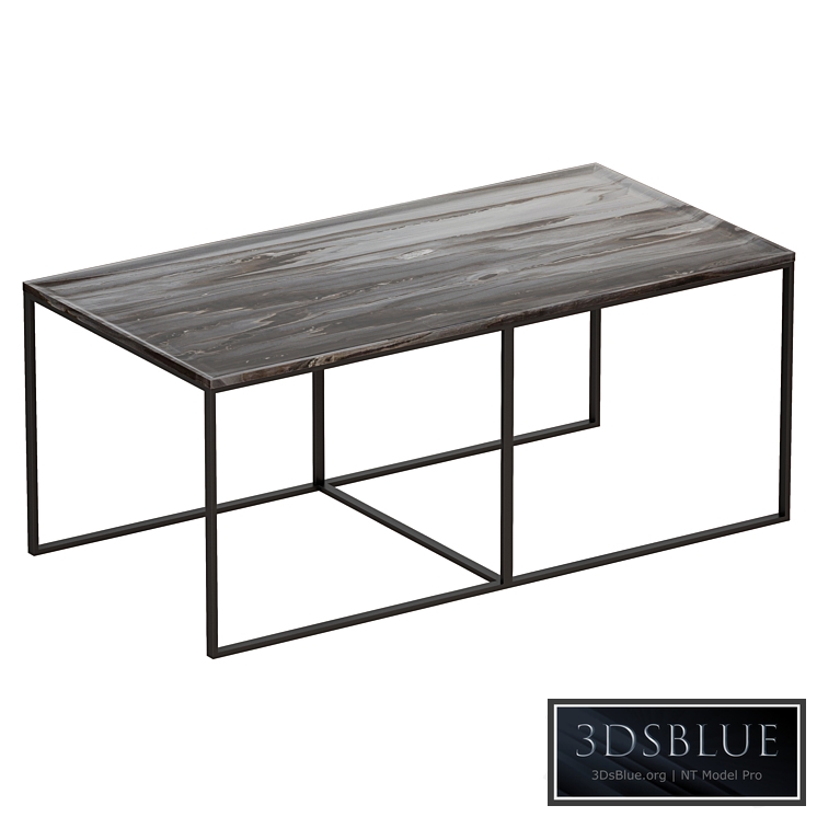 Coffee table with a marble top with a depression. The table top is made of dark marble with a unique pattern. The base is a black metal frame.