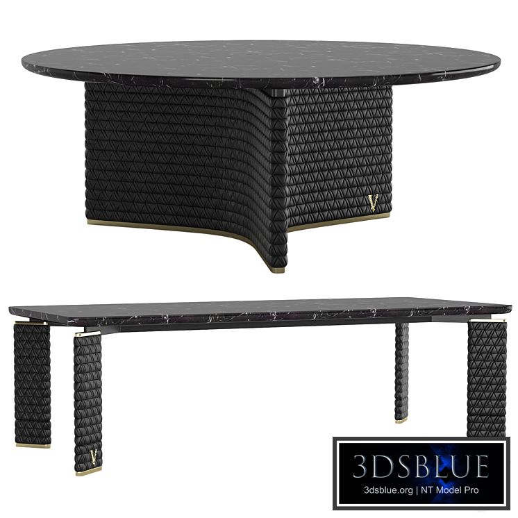 Available in round and rectangular versions. Top and turntable in carrara gioia or marquina marble, base covered in V-stitch leather and metal Barocco V logo.