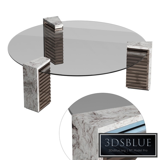 Low table composed by top in smoked glass with 8 mm thickness, encased in 3 externally bases covered in marble by open-book vein match. Internal sides covered in doublel layer stainless steel with engraved stripes in bas-relief, alternating polish and satin finish. Metal parts are available in the metal finish selection.